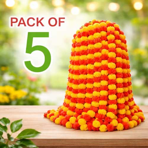 Bright and long-lasting artificial marigold garland designed for traditional décor, spiritual ceremonies, backdrop styling, and seasonal festive arrangements. Perfect for elegant indoor and outdoor decoration. NOTE: PACK OF 5.
