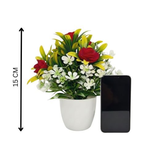 Elegant Artificial Bonsai Rose in Plastic Pot – Mini Faux Tabletop Greenery for Home & Office.